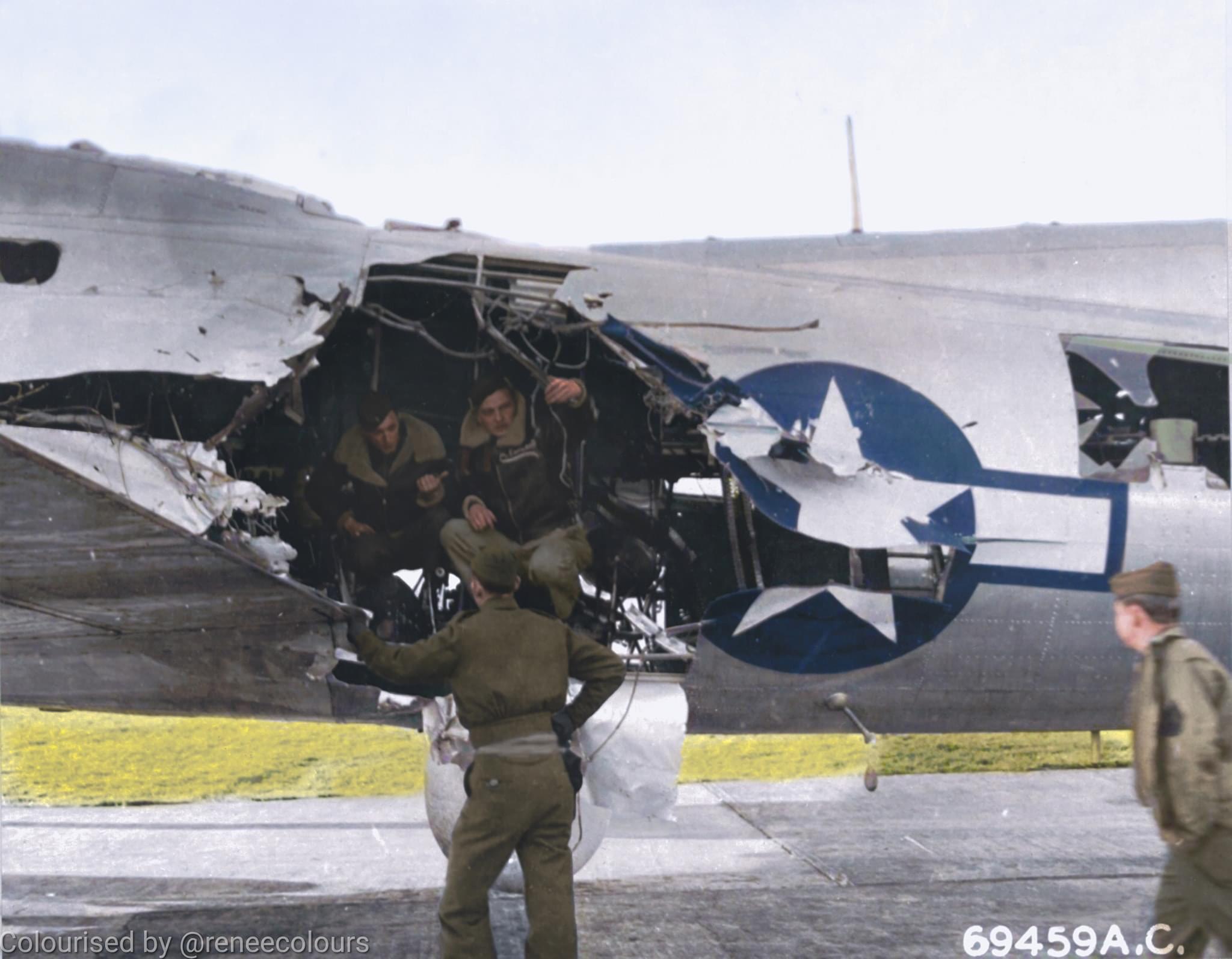 | „Egy 88 mm-es lövedék robbant fel a repülőgép alatt, és tönkretette a 3-as hajtóművet. Egy másik lövedék áthatolt a jobb oldalon, a rádiórekeszben robbant fel, és szétrobbantotta a törzs bal oldalát. A rádiós, John N. Cardiff törzsőrmester hasát, mellkasát és bal karját eltalálták a repeszek. A deréklövész, Joseph Uhrick törzsőrmester hasán, jobb lábán, bal combján és a hátán szerzett sérüléseket. Mindketten azonnal meghaltak. A rádiós munkahelyén repesz a "Mickey" (Radar Bombsight) kezelőjének, Jordan D. Cannon hadnagynak a bal lábába csapódott, súlyos töréseket okozva. Túlélte, de végül elvesztette a lábát. A fedélzeti mérnököt, James R. Kilgallen törzsőrmestert a felső toronyból a repülőgép orrába lökte a nyomás, de nem sérült meg.” (Kevin Pearson) |