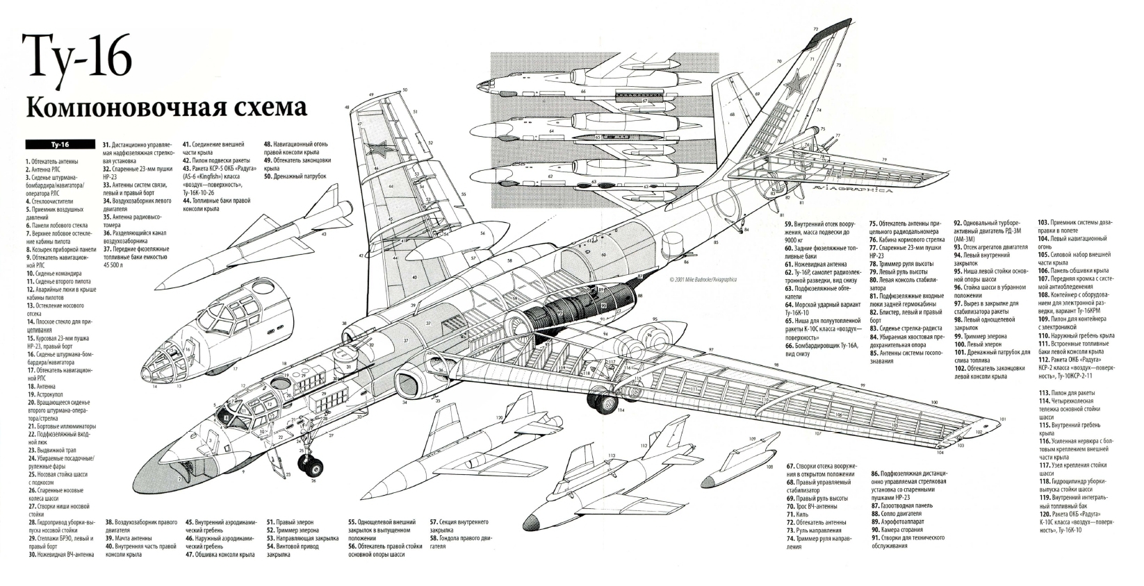 | A Tu–16 (NATO-kódja: Badger) a Tupoljev tervezőiroda által az 1950-es években fejlesztett sugárhajtású bombázó repülőgép. A Szovjetunión kívül Egyiptom, Irak, Szíria és Indonézia is rendszeresítette. Kínában licenc alapján H–5 majd H-6 jelzéssel gyártották. 1953–1963 között három repülőgépgyárban folyt a sorozatgyártása, ezalatt több mint 1500 darabot építettek. A típus több mint öt évtizeden keresztül állt szolgálatban. Számos típusváltozatát fejlesztették ki, többek között robotrepülőgép-hordozó, légi utántöltő, felderítő és rádióelektronikai harcra alkalmas változata készült. A Tu–16-os szolgált alapul a Tu–104-es utasszállító repülőgép kifejlesztéséhez. Kina Xian H-6 néven gyártotta. |