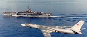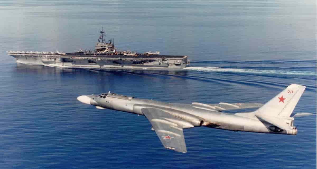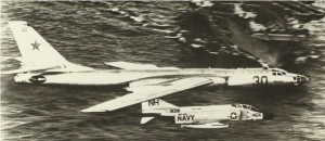 | Szovjet Tu-16 egy amerikai hordozó mellett repül el. |