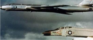 | Amerikai hordozó előtt áthúzó Badger alatt egy F-4 Phantom a VF-84-től. |